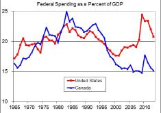 Canadian federal spending fell to 15.1 percent of GDP in 2013 and is projected to decline to 14.0 percent by…