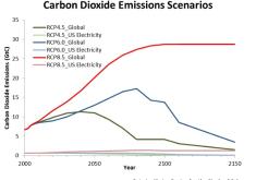 This chart shows three carbon dioxide emissions pathways generated from IPCC scenarios (one high-end, one low-end, and one middle of…