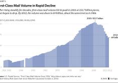After rising steadily for decades, first-class mail volume hit its peak in 2001 at 103.7 billion pieces, then began to…