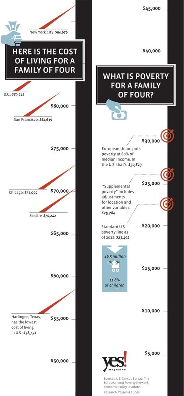 The method for calculating the poverty line, adopted in 1965, was simple: three times the cost of groceries. IT was based on a 1955 USDA finding that families spent about 33% of their money on food. But now the average American family spends only 6% or 7% of its budget on groceries. Other things cost more—yet there's been no adjustment.
