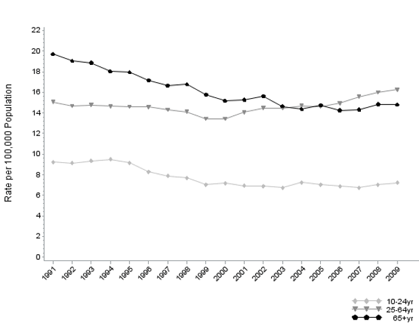The suicide rate among Americans age 65+ has decreased from 19.7 suicides per 100,000 people in 1991 to 14.78 in 2009. Conversely, the suicide rate among adults age 25-64 has increased from 13.43 suicides per 100,000 people in 2000 to 16.25 in 2009.