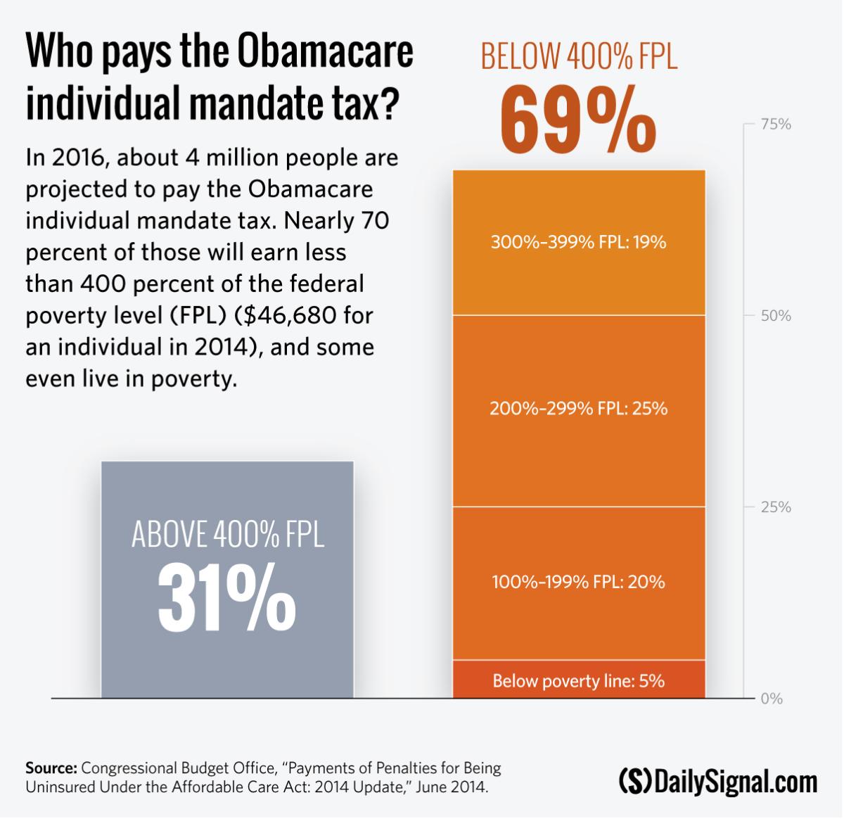 In 2016, about 4 million people are projected to pay the Obamacare individual mandate tax. Nearly 70 percent of those will earn less than 400 percent of the federal poverty level (FPL) ($46,680 for an individual in 2014), and some even live in poverty.