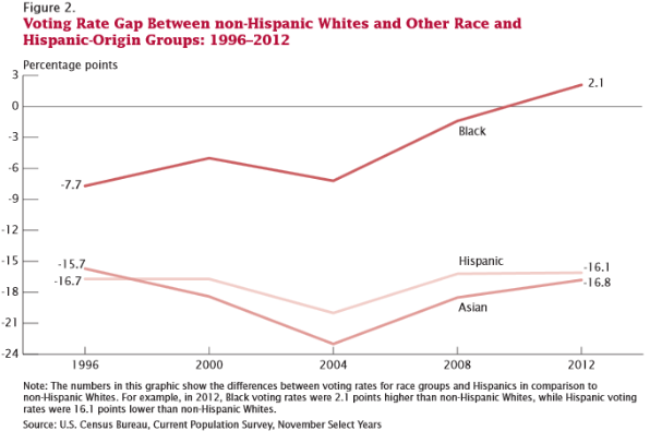 The voting rates of Hispanics and Asians are significantly lower than the voting rates of non-Hispanic Whites. They fall 16.1 and 16.8 points below non-Hispanic White rates respectively. During this span of time, Blacks have managed to increase their voting rates, surpassing non-Hispanic Whites.