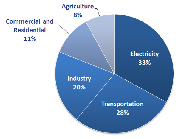 In total there were 6,702 million metric tons of U.S. greenhouse gas emissions in 2011. The plurality of greenhouse gas emissions were generated by electricity production (33%). The transportation sector was also responsible for a large amount of emissions (28%).