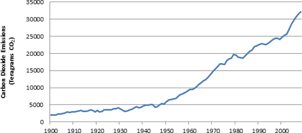 Global carbon dioxide (CO2) emissions from fossil-fuels have increased from about 2,500 teragrams of CO2 in 1900 to 32,000 teragrams of CO2 in 2008. Since 1990, global CO2 emissions have increased by 1.5 times.