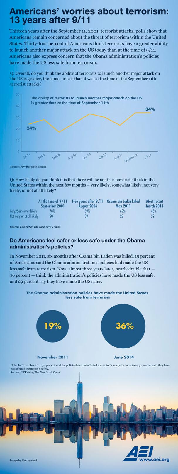 Thirteen years after the September 11, 2001 terrorist attacks, polls show that Americans remain concerned about the threat of terrorism within the United States. Thirty-four percent of Americans think terrorists have a greater ability to launch another major attack on the US today. Americans also express concern that the Obama administration’s policies have made the US less safe from terrorism.
