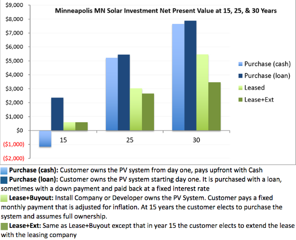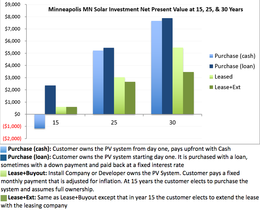 The answer depends on a variety of factors. This chart uses best estimates for leasing and financing terms based on ILSR's research—but you can use our Ultimate Solar Calculator to customize the results for you, including changing the city to reflect where you live. Check it out here: www.ilsr.org/ultimate-solar-c…