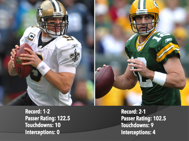 Drew Brees and Aaron Rodgers have only faced each other 3 times ever. This week shapes up to be a very entertaining game between these two gunslingers. The Saints have had a rough season so far with a record of 2-4, but Brees has had a good statistical history against Green Bay. I highly recommend tuning in Sunday night to watch this battle.