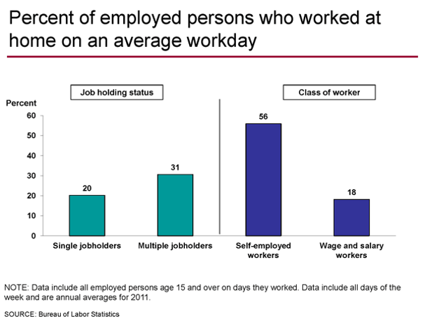 Multiple job-holders are more likely to work at home than single job-holders. Self-employed Americans are more than 3 times as likely to work at home than wage and salary workers.