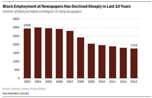 Since 1997, there has been a staggering 40% decline in the number of black journalists working at newspapers. This is steeper than the rate of decline of whites, Hispanics, and Asians. This drop coincides with the financial hardships journalism faces today. According to Pew however, there is a higher representation of minorities in local television journalism.