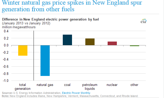 An increase in natural gas demand from New England's limited supply caused a spike in prices. This reduced natural gas use for power generation and generation from other fuel sources increased. The decrease in natural gas generation was cushioned by coal and nuclear power. These were at higher rates in 2013 than they were in 2012.