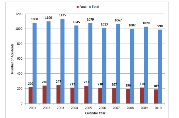 Personal flying accidents in the US decreased over the 2001-2010 decade. A fraction of the total accidents were fatal for all years during this span.