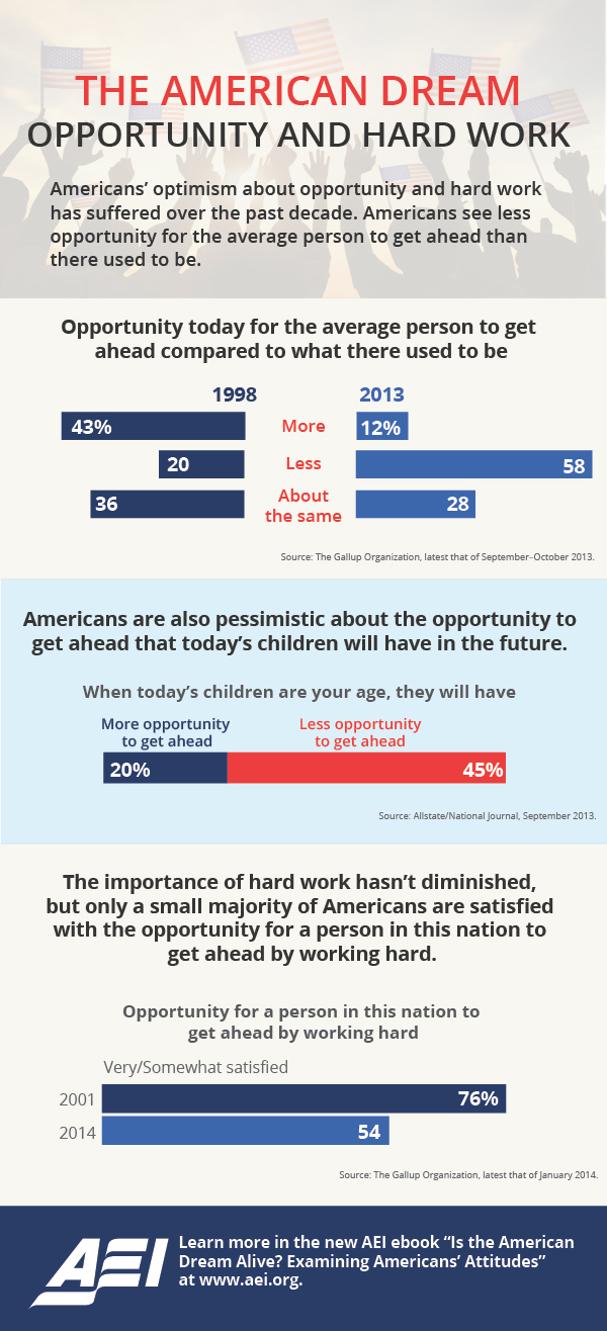 I find the third statistic particularly troubling. I firmly believe that America was founded, and has found success by relying on the ideal that through hard work and determination, a person will be rewarded with the opportunity to get ahead in life. Incentives matter. The steep decline in people who believe that ideal could spell trouble for our nation.