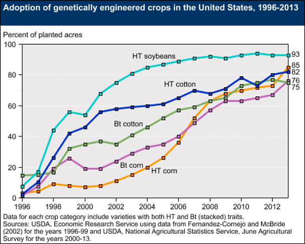 Herbicide-tolerant (HT) crops, allowing utilization of otherwise-deathly herbicides for weed control, and insect-resistant (Bt) crops, have grown rapidly as a share of total US crop acreage. Both genetically-engineered cotton and corn reached 90% of their total crop production; biotech soybeans surpassed even that, with 93% of soybean acreage. America leads the world in GE crops-- 40.8% of global production.
