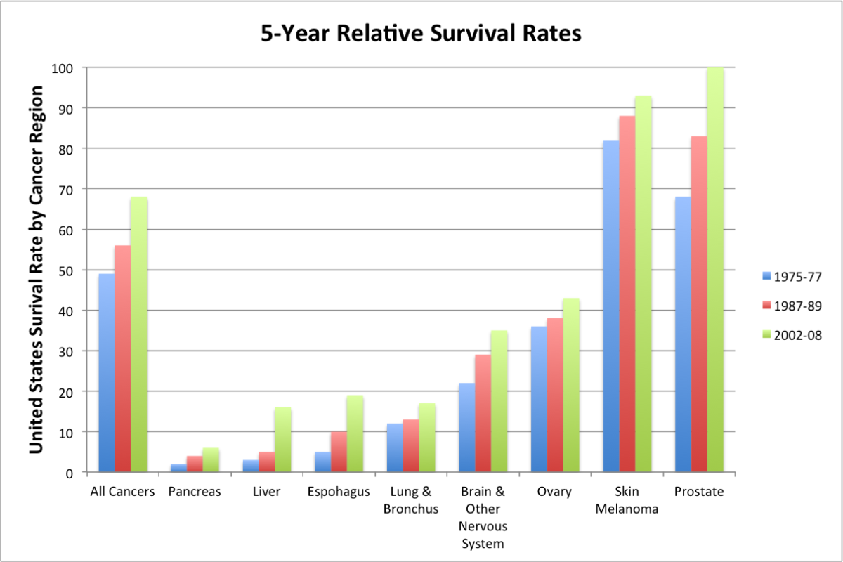 While surviving certain cancers has become nearly assured, cancers of the pancreas, lung, esophagus, and liver have continued to kill at alarming rates. The former three are directly related to smoking, and liver cancer to alcohol. There exists a statistically significant disparity between all races and African Americans, for all cancers, 1975-77, 39%, 1987-89 43%, and 2002-08 60%.