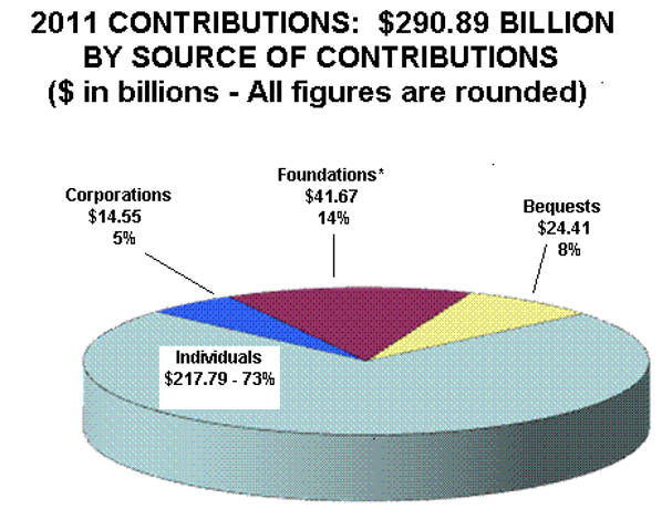 In 2011, most charitable contributions given by Americans came from individual citizens. Despite restrictive economic conditions, Americans are still willing to give to their favorite charities.