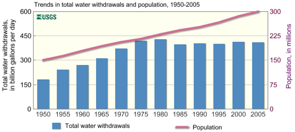 The rate of water withdrawal (including fresh and saline) in the U.S. has remained steady since peaking in 1980 at 351 billion gallons of water withdrawn per day. Despite a population nearing 300 million in 2005 (90 million more people than in 1975), the water withdrawal rate remained at 1975 levels at 328 billion gallons per day.