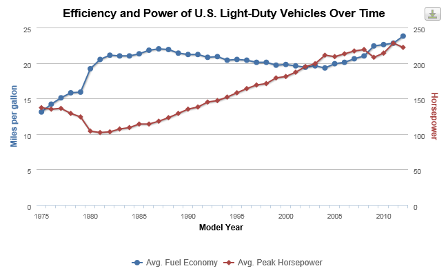 Average fuel economy of U.S. light-duty vehicles has increased over 80%, from 13.1 mpg in 1975 to 23.8 mpg in 2012. However, for a time, horsepower took precedent over fuel efficiency, as average fuel economy decreased from 22 mpg in 1987 to 19.3 mpg in 2004, while average horsepower increased from 118 to 211 (see source about trucks).