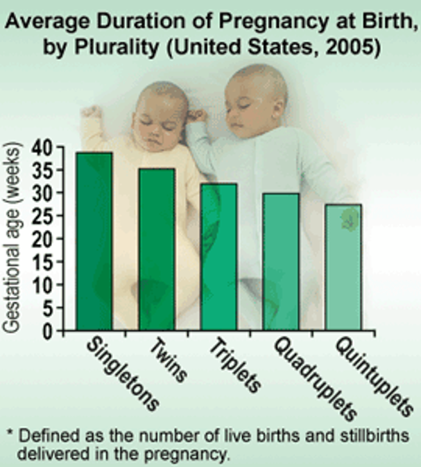 The average duration of pregnancy decreases as the plurality of births increases. The average gestational period for singletons was 38.7 weeks in 2005. However, the average gestational period was only 35.2 weeks for twins, 31.9 weeks for triplets, 29.8 weeks for quadruplets, and just 27.4 weeks for quintuplets and higher.