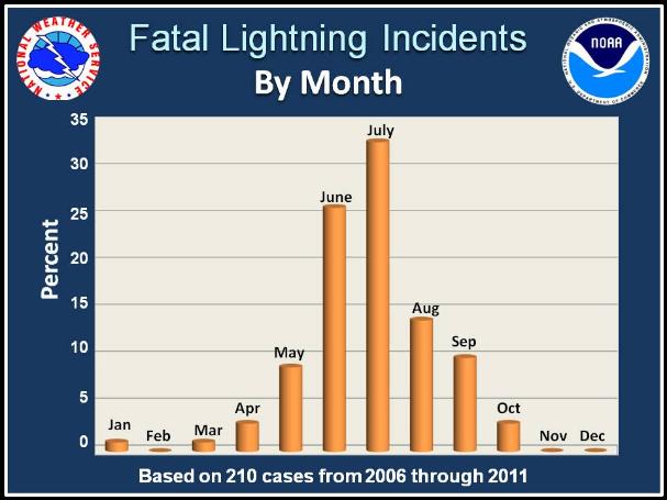 Of the 210 reported fatal lightning incidents in the U.S. from 2006 to 2011, over 30% occurred in July, making July the most dangerous month for fatal lightning strikes.