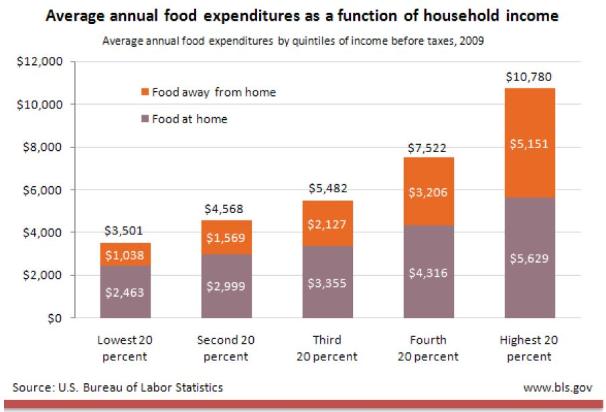 In 2009, Americans in the highest quintile of household income spent an average of $10,780 on food for the year, three times more than the lowest quintile spent. Wealthier households also spent proportionally more on food away from home versus food at home than did poorer households.