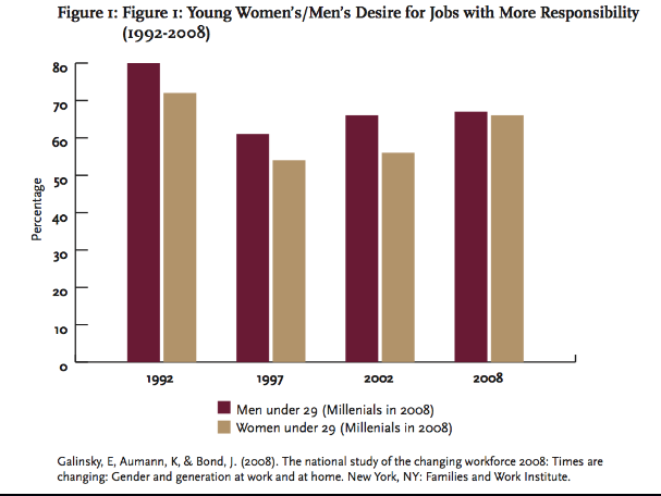 According to the Families and Work Institute, young women are now as ambitious as young men when it comes to career advancement. This chart was excerpted from The New Dad: Caring, Committed, and Conflicted (2011).
