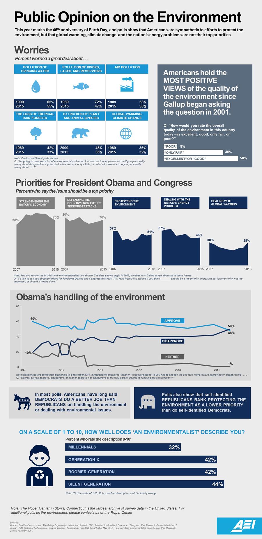 This year marks the 45th anniversary of Earth Day, and polls show that Americans are sympathetic to efforts to protect the environment, but that global warming, climate change, and the nation’s energy problems are not their top priorities.