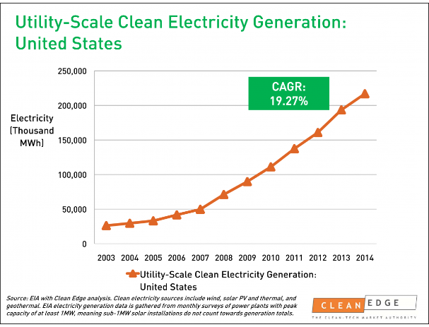Over 200,000 Megawatt hours of generated electricity came from renewable power sources in 2014. This is the first time in history the United States has surpassed that mark. Surely we'll need to continue this upward trend moving forward into the future.