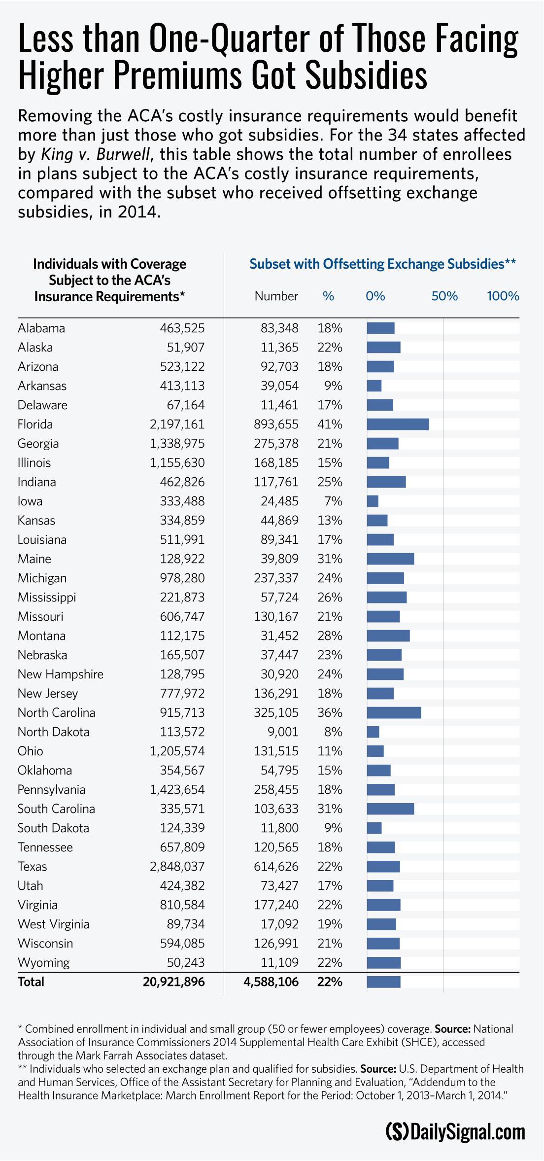 Removing the ACA’s costly insurance requirements would benefit more than just those who got subsidies. For the 34 states affected by King v. Burwell, this table shows the total number of enrollees in plans subject to the ACA’s costly insurance requirements, compared with the subset who received offsetting exchange subsidies, in 2014.