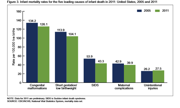 In 2011, these top five causes accounted for 56% of all infant deaths in the United States. The leading cause of infant death in 2005 and 2011 was congenital malformation. The mortality rates for four of these causes of death declined from 2005 to 2011, the exception being unintentional injuries.