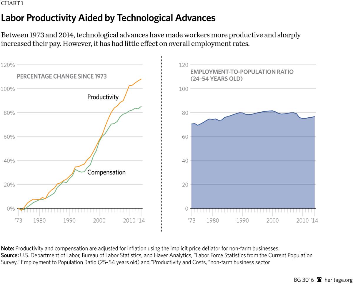 Between 1973 and 2014, technological advances have made workers more productive and sharply increased their pay. However, it has had little effect on overall employment rates.