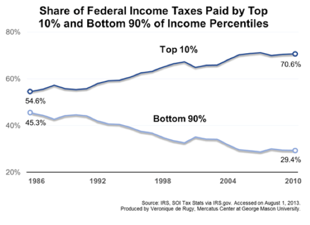 Check out this new chart from Veronique de Rugy at the Mercatus Center, which shows that high earners are paying a growing share of total federal income taxes.