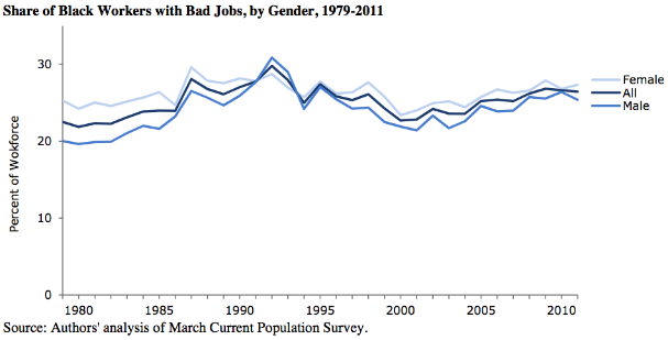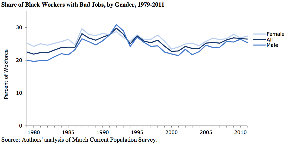 A “bad job” pays less than $19/hour, lacks health insurance, and lacks an employer sponsored retirement plan. In 1979, 22.5 percent of black workers were in bad jobs; by 2011, the share had increased to 26.4 percent.