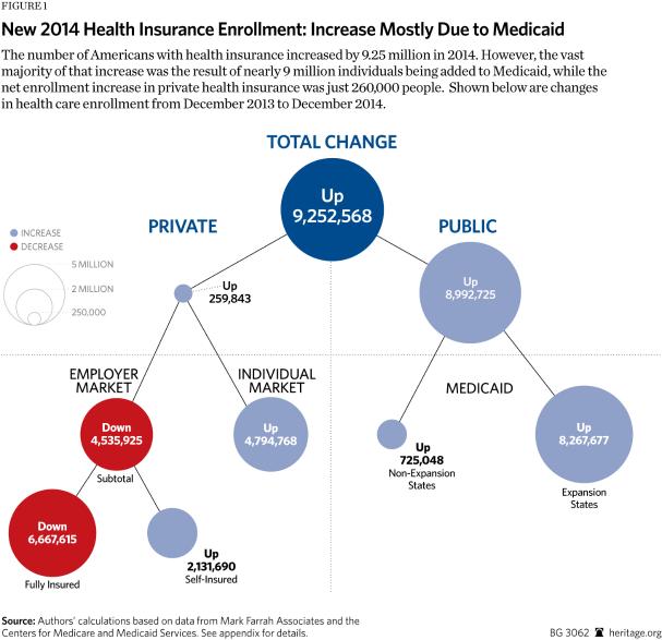 The number of Americans with health insurance increased by 9.25 million in 2014. However, the vast majority of that increase was the result of nearly 9 million individuals being added to Medicaid, while the net enrollment increase in private health insurance was just 260,000 people. Shown below are changes in health care enrollment from December 2013 to December 2014.