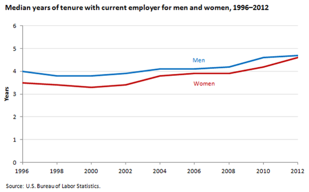 In recent years, the gap in median tenure between genders has closed. The median tenure for men in 1996 was 4 years, compared to only 3.5 years for women. In 2012, the median tenure for men was 4.7 years, only 0.1 years more than the 4.6 years of median tenure for women.