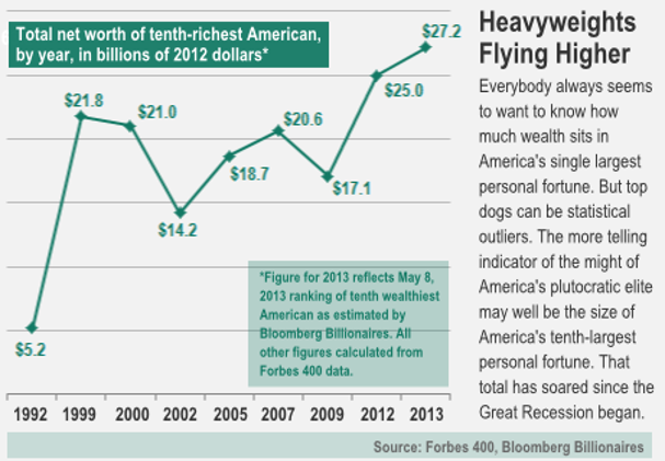 The nation's deepest pockets have survived the Great Recession in fine form. By one measure, wealth at America's economic summit has multiplied over five-fold, after inflation, since 1992.