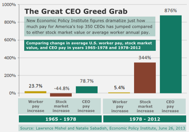 Since 1965, the gap between the compensation of America's top corporate chief executives and average worker pay has widened by 14 times over, the Economic Policy Institute calculates.