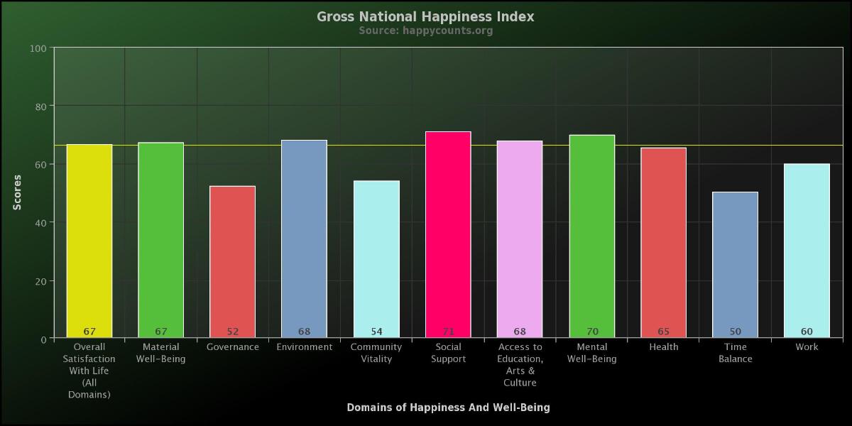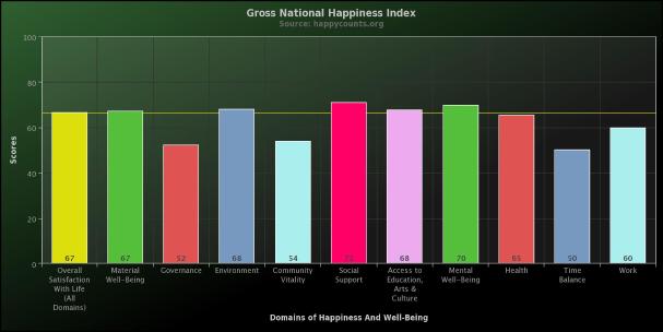 The Gross National Happiness Index measures where we perceive ourselves to be hurting or thriving. It is a subjective opt-in measure of over 25,500 people who have taken the survey between March 2011 and September 2013. This information guides people for personal decisions and gives policy-makers an idea of what people really care about.