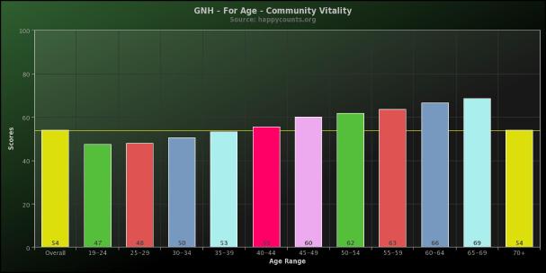 The Gross National Happiness Index for the domain of community tells us that as we age, our sense of community - relationship with friends and family, volunteerism and trust in others - increases. These results are from over 25,500 people who took the survey between March 2011 and September 2013.