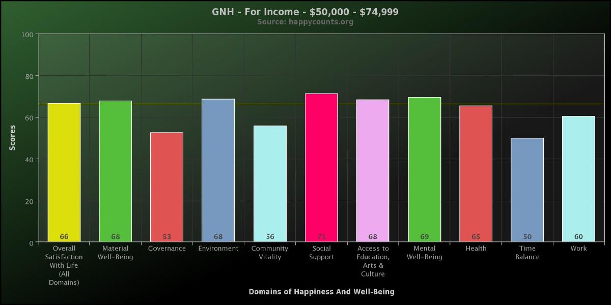These are the Gross National Happiness Index scores for people with income between 50 -74,999K. These results are from over 25,500 people who took the survey between March 2011 and September 2013.