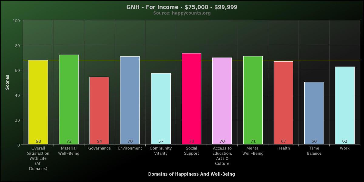 These are the Gross National Happiness Index scores for people with income between 75 -99,999K. These results are from over 25,500 people who took the survey between March 2011 and September 2013.