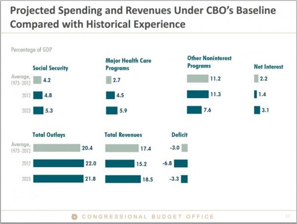 Budget chief Douglas Elmendorf says the fundamental federal budgetary challenge is due to federal programs becoming much more expensive because of the retirement of the baby boomers and the rising costs of health care. This chart shows just how the federal budget is changing, with Medicaid, Medicare, and Social Security gobbling up more and more of government spending.