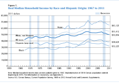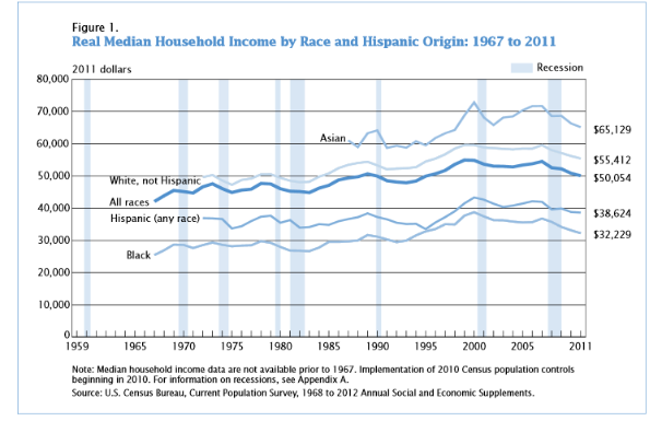 Historically, non-Hispanic whites had higher real median household incomes when compared to other races. However, they were quickly surpassed by the Asian population. Blacks tend to have the lowest real median household income of any race.