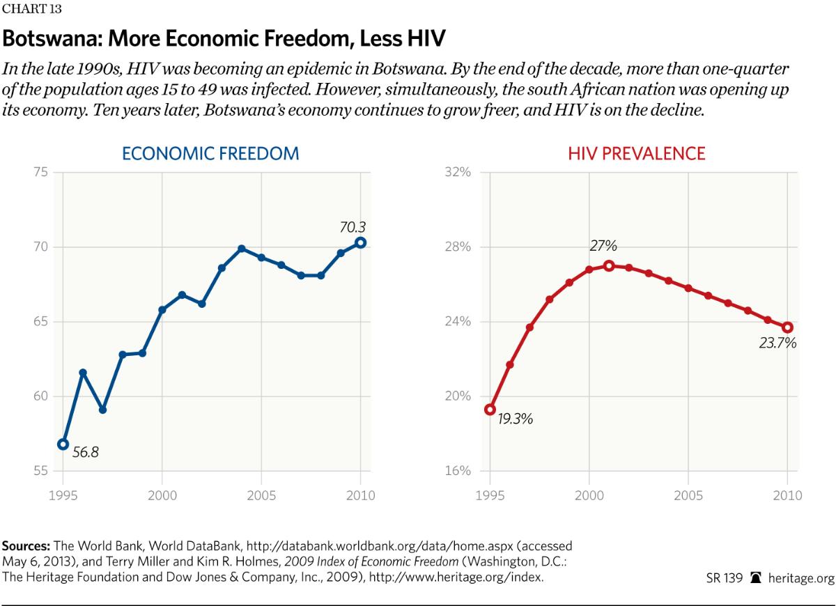 In the late 1990s, HIV was becoming an epidemic in Botswana. By the end of the decade, more than one-quarter of the population ages 15 to 49 was infected. However, simultaneously, the south African nation was opening up its economy. Ten years later, Botswana’s economy continues to grow freer, and HIV is on the decline.