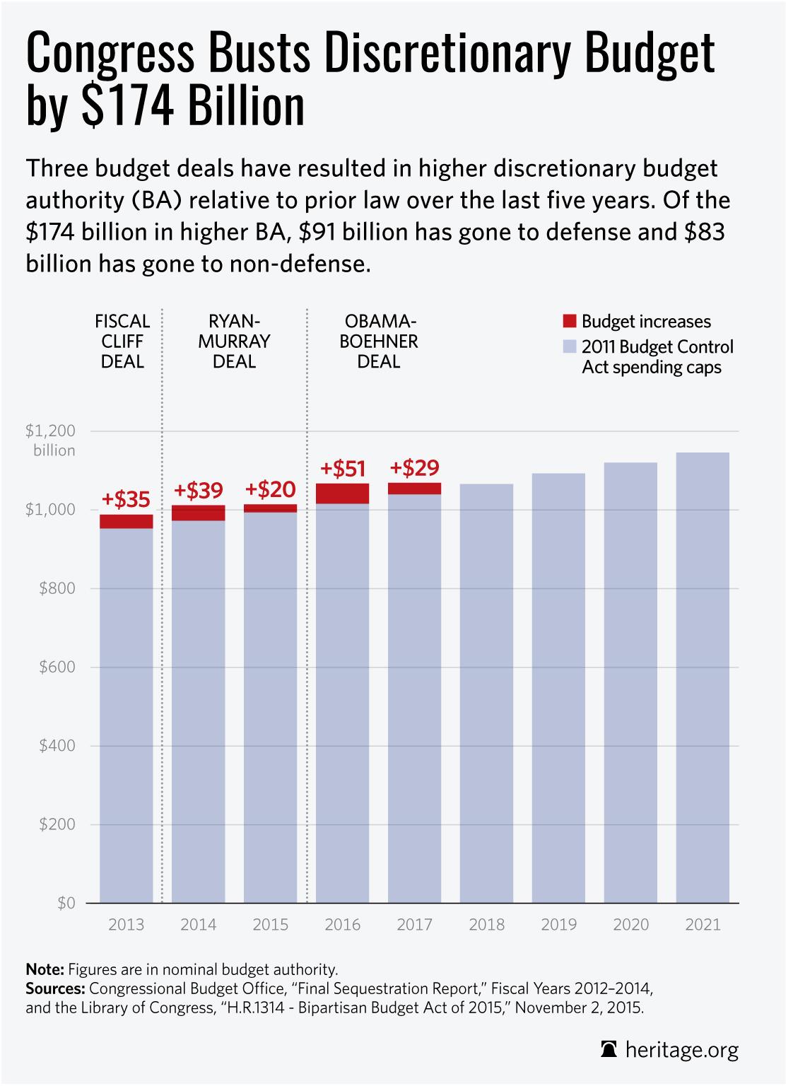 Three budget deals have resulted in higher discretionary budget authority (BA) relative to prior law over the last five years. Of the $174 billion in higher BA, $91 billion has gone to defense and $83 billion has gone to non-defense.