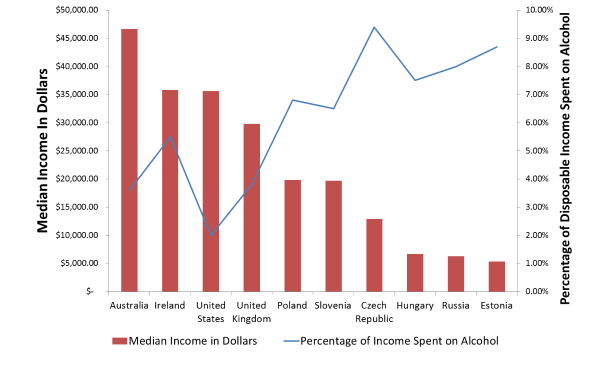 Comparing 2010 annual median incomes to the percentage of those incomes spent on alcohol reveals an alarming trend. The leading country in alcohol expenditure as percentage of income, the Czech Republic (9.4%), has a median income of less than $13,000. The United States has one of the lowest percentage alcohol expenditures at 2%.