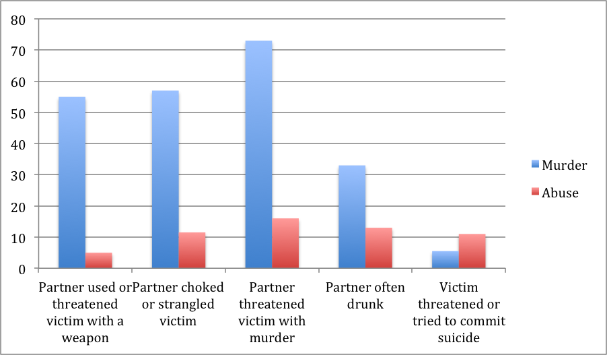 Y-axis shows percentage of relationships which ended in either murder or abuse. Researchers at Johns Hopkins University have identified items on the Danger Assessment list that indicate that an abusive relationship may turn deadly. The study compared two groups of women; 220 who had been killed by their partners and 343 who had been abused, but not killed.