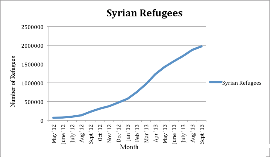 Every day, an average of 5,000 Syrians flee the country. The majority of refugees have been registered in Lebanon, Jordan, Turkey, Iraq and Egypt. The number is likely to exceed 5 million by 2015. A further 4.25 million are currently displaced within the country.