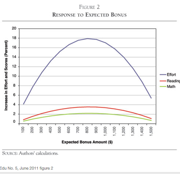 Imagine how motivated a teacher would be to put in extra effort if the likelihood of qualifying for the bonus were 100 percent. As this figure shows, policymakers should take care not to make the bonus too easy or too difficult to get, as either extreme will do little to motivate teachers.