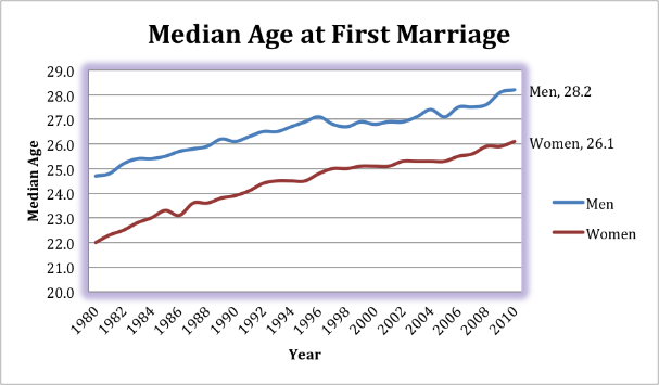 Median age at time of first marriage is on the rise. Since 1980, it has risen 3.5 years for women and 4.1 years for men. American women still marry younger than men.
